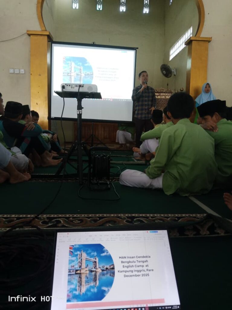 Dalam sosialisasi ini, tim dari MAN IC Bengkulu Tengah memperkenalkan konsep kegiatan English Camp sebagai salah satu upaya untuk meningkatkan kemampuan berbahasa Inggris siswa madrasah. Melalui program ini, peserta akan menjalani pembelajaran intensif di Kampung Inggris Pare, yang dikenal sebagai pusat pelatihan bahasa Inggris terbaik di Indonesia.