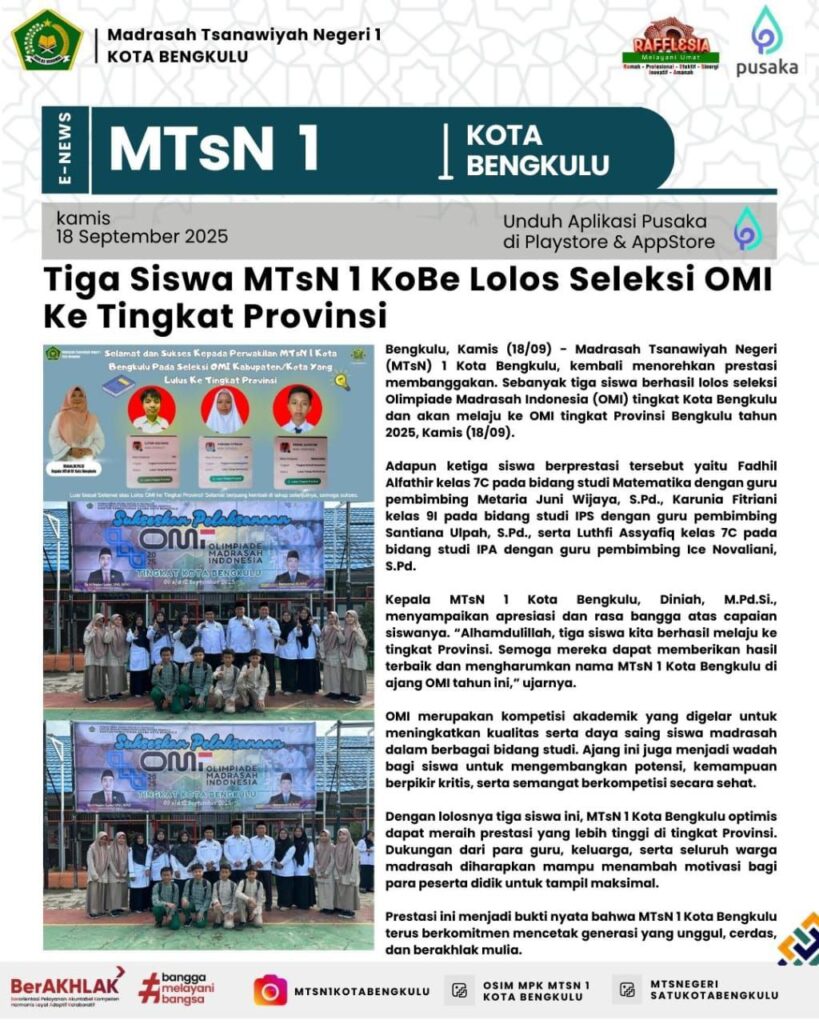 Kepada para siswa MTsN 1 Kota Bengkulu yang telah lulus seleksi Olimpiade Madrasah Indonesia (OMI) tingkat Kabupaten/Kota dan melaju ke tingkat Provinsi: